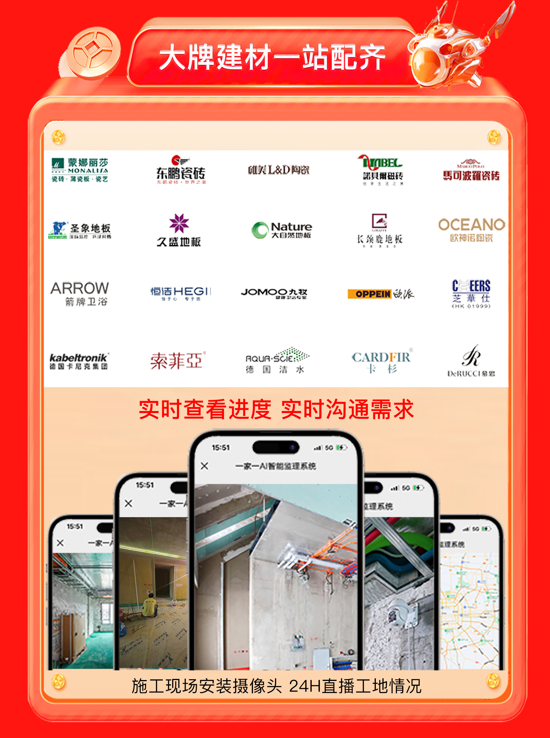 在裝修過程中,透明溝通與品質(zhì)把控是業(yè)主最關(guān)心的問題。一家一裝飾引入前沿科技,并承諾八大特權(quán),為您全程保駕護航: